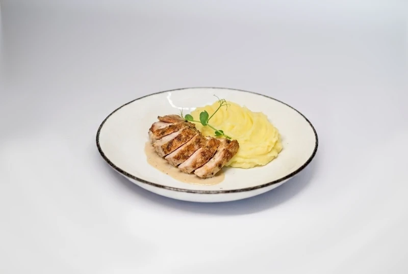Куриная грудка маринованная с аджикой, приготовленная по технологии су-вид, подается с картофельным пюре и сливочным соусом на основе демиглас